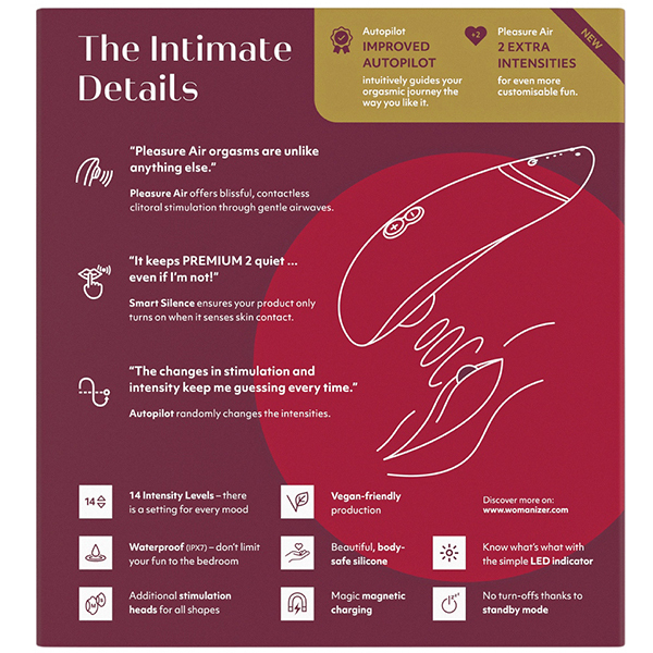 人気のウーマナイザーから待望の商品がリリース!「ウーマナイザー プレミアム2 (ボルドー)」。その名に恥じないプレミアムな機能を搭載♪ボタンを押さなくてもお肌に当てるだけで吸引が自動でスタートし、離すだけで振動が止まるタッチセンサー機能を搭載。この機能はカップルさんで使うときにも本当に大活躍します♪さらにパイロットモードを搭載し、ボタン操作をしなくてもWomanizer自身が吸引の強弱を自動でコントロールしてくれます。これにより予測できないゾクゾクとした楽しみが味わえます♪振動レベルは弱・中・強の3段階!ゆったりとラグジュアリーな時間を過ごすのに最適です♪素材はシリコン/ABS樹脂で2時間のフル充電により連続4時間での使用が可能です。※製造時期によりパッケージが異なる場合がございます。※こちらの商品は受注発注商品の為、ご注文から発送までに3、4営業日掛かる場合が御座います。