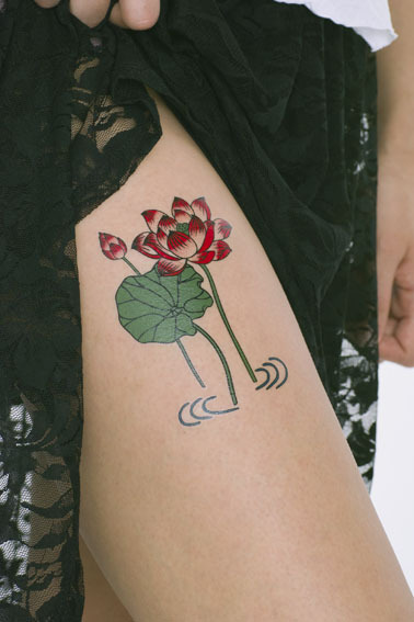 パーティーやお祭りにも大活躍!レギュラーサイズのタトゥーシール「蓮華」。コスプレ等に合わせて露出した肌に貼り付けるだけ!特殊な素材を使用しているので皮膚の動きと一緒に伸び縮みし、入浴したり海やプールに入っても2〜3日は取れません。祭り化粧を取る際は、専用のクリーナーやクレンジングクリーム、ベビーローション等で拭き取って下さい。