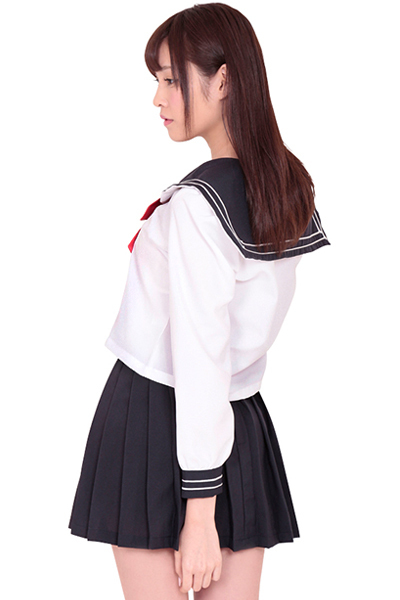 長袖ブラウスに定番の白×紺ラインがデザインされた、清楚感溢れるセーラー服コスチューム。少しミニ丈なプリーツスカートは、清楚だけどどこかセクシー!紺×白に赤いリボンがマッチし、王道だけど可愛らしいセーラー服に仕上がっています。
