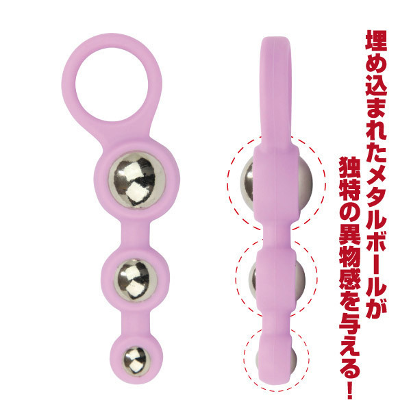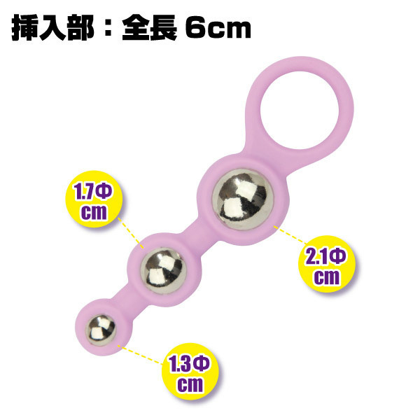 ヒンヤリとした質感が新たな快感を呼び起こすアナルグッズ「カラフルピット メタルボール ショート」。しなやかでソフトなシリコン素材の中に、重みのあるメタルボールをはめ込んだ異素材の出会いが新鮮で刺激的!小・中・大3種類のボールで快感も徐々に大きく…。使いやすい持ち手リング付きで、初心者にも扱いやすいアナルグッズです。