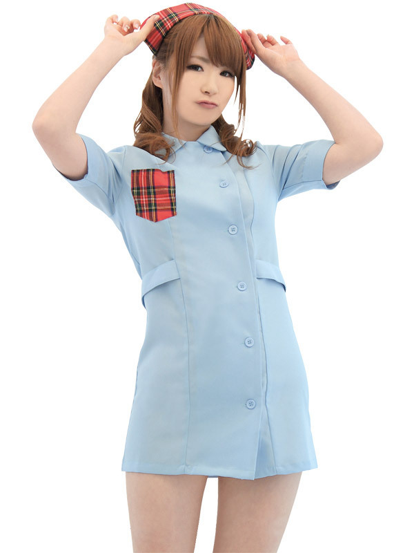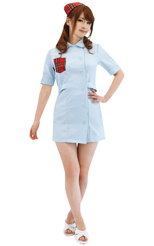 涼しげな水色カラーのナースワンピースに、赤チェックの胸元ポケットを施し、同柄のナースキャップで乙女チックなイメージに!丸襟とボタン仕様がオシャレのアクセントになり、可愛さもグンっとUP!彼もときめくナース風コスチュームです。※ストッキングは付属しません