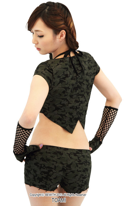 お色気作戦で敵もメロメロ?セパレートタイプのアーミーコスプレ。胸元のネットがセクシーさを際立たせるトップスにはサスペンダーが付属、ショートパンツをしっかりホールドします。迷彩柄の手袋やリボンまでセットになったアーミーコスプレ衣装です。