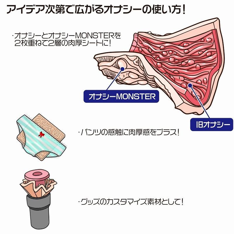 爆発的ヒットホール「ぐちょ濡れ名器MONSTER G」が、オナニー用シート「オナシー」になりました!あの複雑に絡む外側の生体表皮をモチーフに、弾力のある無臭の極上スキンに仕上げました。手コキや床オナなど、アイデア次第で使い方は無限大!また、筒状のオナホールより洗いやすく乾かしやすいので、衛生的にお使い頂けるのもポイントです。漫画解説付き指南書とローションも付属しています。