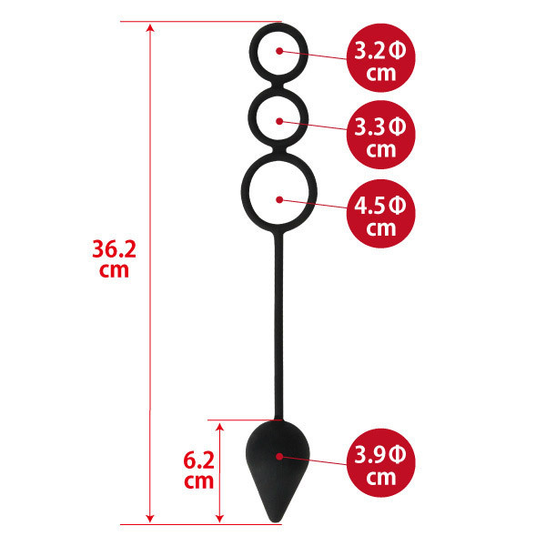 パッケージ:20.0×13.0×5.5cm 本体:全長:36.4cm 内径小3.1φcm・中3.1φcm・大4.5φcm プラグ部分:6.4×3.9φcm