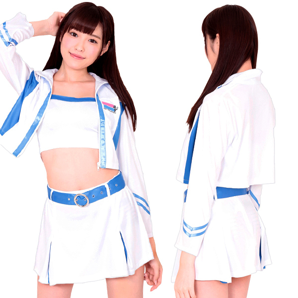 「あたしが来たからには絶対に負けないぞ!」ヘソ出し&ミニスカのセクシーな衣装で全力応援する、レースの女神様!白×水色の色使いが爽やかな印象を与える、レースクイーンコスチューム。ジャケット・スカート・ブラ・ベルトの4点セットです。