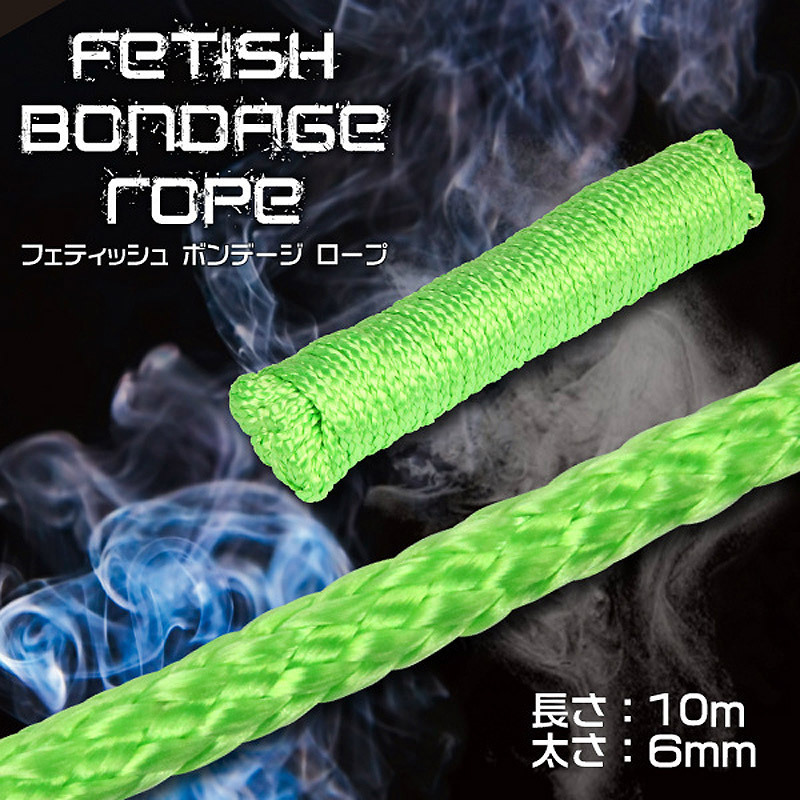 優しい縛り心地で痛みを感じさせない!コスプレ感覚で楽しめるSMロープ。●蛍光色のグリーンカラー●全長10m・太さ6mm●肌を傷めず、痕も残りにくいソフト素材●拘束プレイ初心者の方でも扱いやすいのがポイント●シルクのような肌触りがたまらないフェティッシュロープ●長めのロープなので亀甲縛りや達磨縛りもお手の物!本格的な縛りを楽しめるSM拘束グッズです。