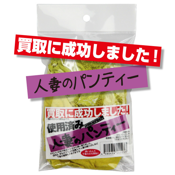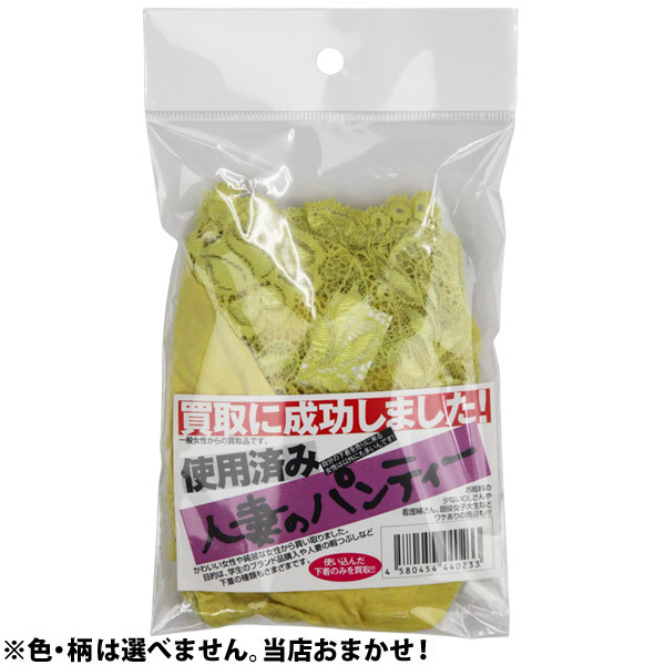 他人妻とのイケナイ関係を妄想させる、人妻の匂いがたっぷり染み込んだ匂い付きパンティー。今脱いだかのような、アソコのツーンとくる甘酸っぱい香りが妄想を膨らませ興奮を呼び起こします。クンクン嗅いでもよし、愛用のダッチワイフに履かせてもよし、自分が履くのもよし!色んなシチュエーションでオナニーを楽しむことができるアイテムです。※中身の色柄、形状等はその都度異なります※USED加工を施した新品未使用品です