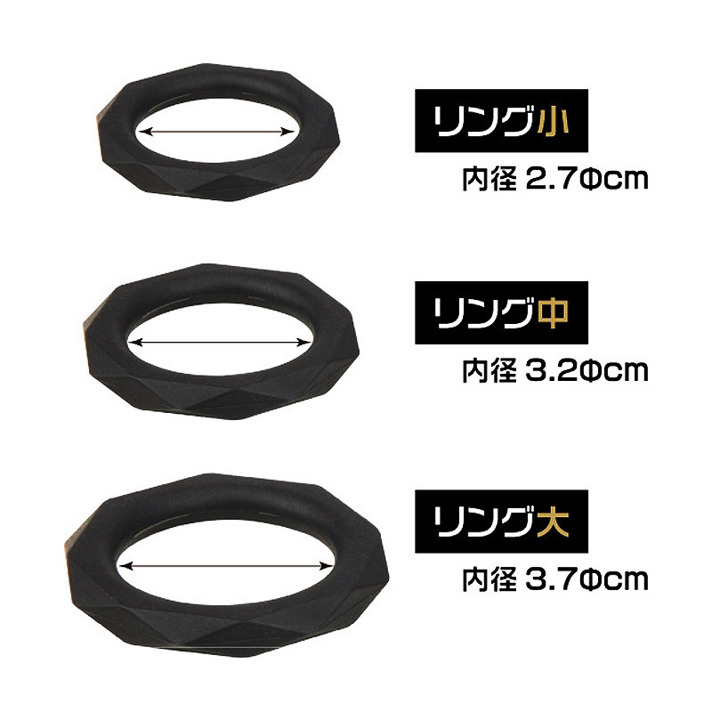 スタイリッシュなカッティング加工を施した、ブラックシリコンの男性用コックリング3個セット。●さらりとしたシリコン100%素材を使用●リング周囲を宝石のファセットカットのように加工●気分で選べる小中大の3サイズセット●内径:小2.7φcm・中3.1φcm・大3.6φcm。竿を程よく締めつけることで早漏防止にも!さらに、カット加工がパートナーへ刺激を与えます。その日の気分でサイズを使い分けたり、それぞれを玉・根元・カリ首に同時装着してもOKな万能サポートグッズです。