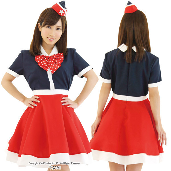 レトロながらもポップな雰囲気漂うキャビンアテンダント風コスチューム。●レッド×ネイビー×ホワイト●ライン入りワンピース(リボン付き)●星モチーフ付きのミニ帽子。CAには見えないほど、ハイカラなデザインに仕上げたオシャレで可愛いコスプレ衣装です。