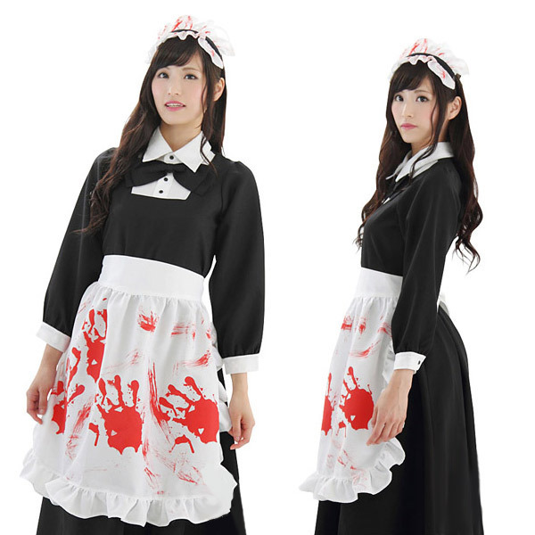 うそっ、血まみれ…?!赤い手形がベッタリついたホラーテイストのメイド服。●ハロウィン仮装に便利●定番の白黒メイドを一瞬ぎょっとするほどスプラッターに…●スカート丈が足首まであるクラッシックな長袖ワンピース●後姿はごく普通●手形ペタペタ・フリルエプロン●血が飛沫したブリムカチューシャ。一体型ワンピースは鮮血加工されていないので、お手持ちのエプロンを着ければ普通にお使いいただけます。