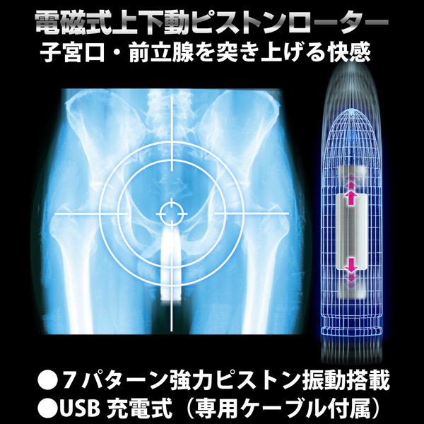 敏感部分の最奥まで響く!電磁石によるリニアピストン機能を内蔵した弾丸型のシングルローター。●ゴージャスなゴールドカラー●便利なUSB充電式●充電90分で約1時間の連続使用可能●充電中→赤ランプ点灯/充電完了→青ランプ点灯●アソコ&アナルのどちらにもスムーズに挿入できる細身ボディ●7種類の強力振動を搭載●リニアピストン機能付きで楽しさ倍増●ボタン長押し→電源ON/押す度にパターン切替え●長押し→電源OFFはどのタイミングでもOK●専用ケーブル・AC変換アダプタ付属。電磁石の反発を利用して上下にピストン運動!子宮口・前立腺をズンズンと激しく突き上げて極上の快感を生み出す、満足感の高い男女兼用ローターです。※初回は必ずフル充電してからご使用ください。