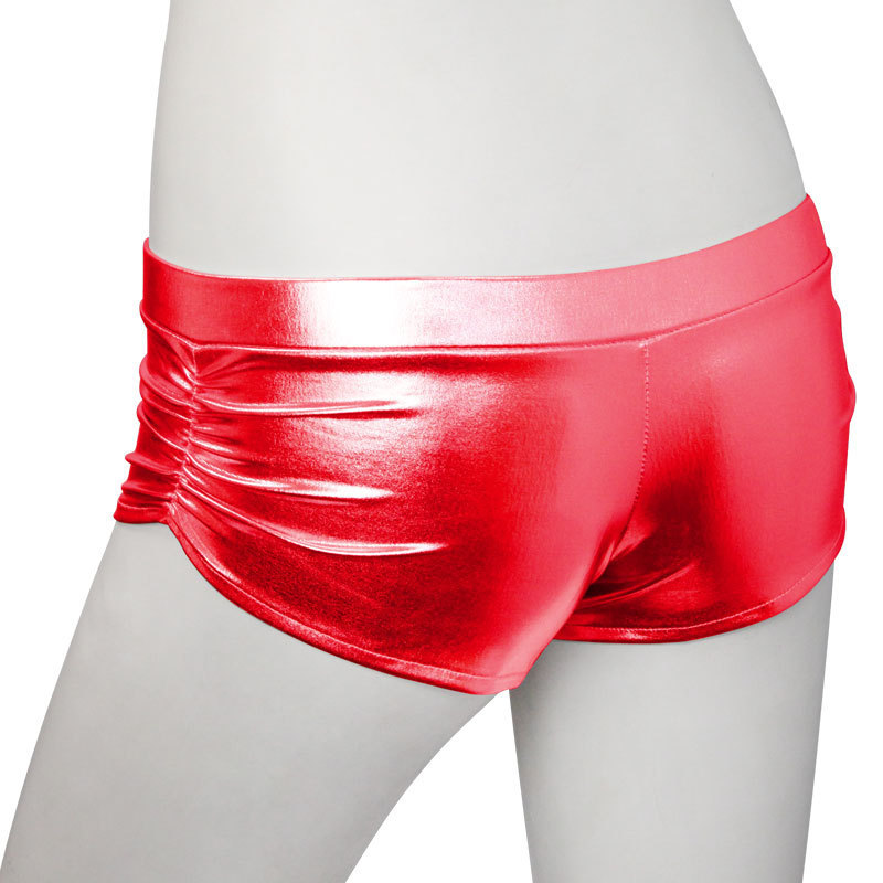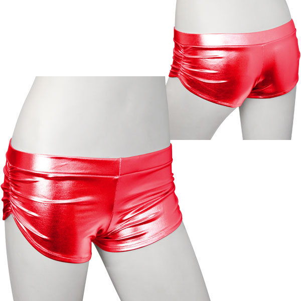 ピカピカに光り輝くメタリックアイテム!ステージ衣装にもぴったりな目立ち度バツグンのホットパンツ。●シャイニーなメタリックレッド●両サイドギャザーデザイン●伸縮素材でヒップラインを強調。イベントのダンス衣装にも使える派手かわコスチューム♪ミニスカコスプレの下に履いて見せパンとしても使えます。