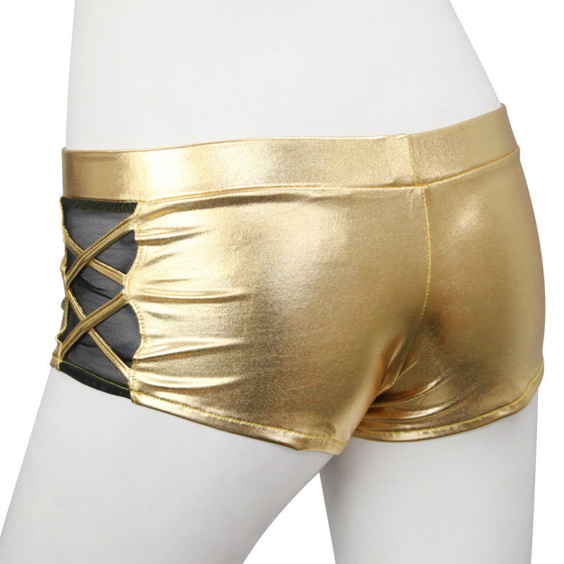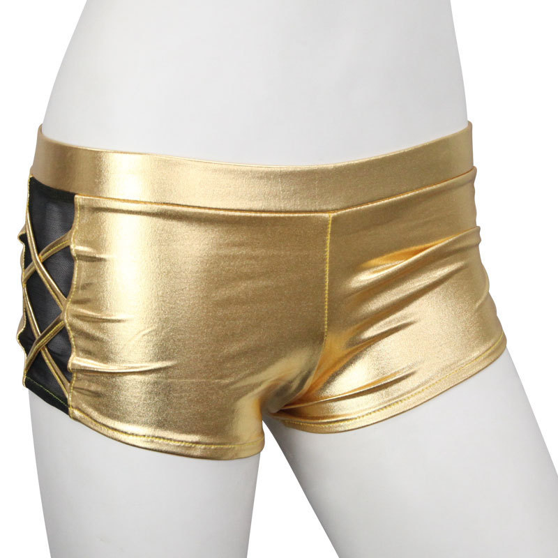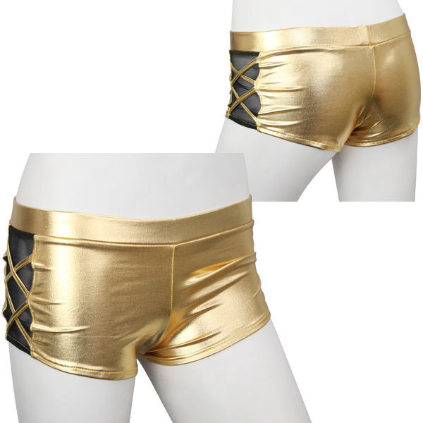 穿くだけで注目度ナンバーワン!メタルに輝くセクシーホットパンツ。●メタリックなゴールドカラー●光をキラッと反射するきらめき●ローライズ気味なホットパンツ●両サイドにダブルクロスデザイン●シースルー生地を添えて妖艶に。ただ隠すよりもシースルーによる透け感でセクシーさがさらにUP!ショーやイベントなど目立ちたいシーンで活躍してくれるコスチュームです。