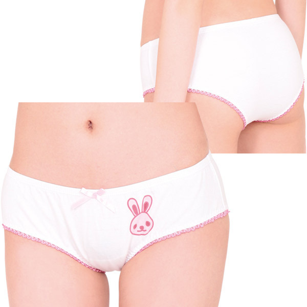 <EROX>ラブリーなうさちゃんプリント付き♪素朴な雰囲気に癒やされるレディースコットンショーツ。●やさしい肌触りの綿混素材●フロントにウサギプリント●ちょこんと控えめなピンクリボン●脚ぐりをぐるりとピコットレースで加工●ヒップを優しく包むフルバック。シンプルだけどインパクトは抜群!深めの履き心地でしっかりフィットしてくれる安心デザインのランジェリーです。