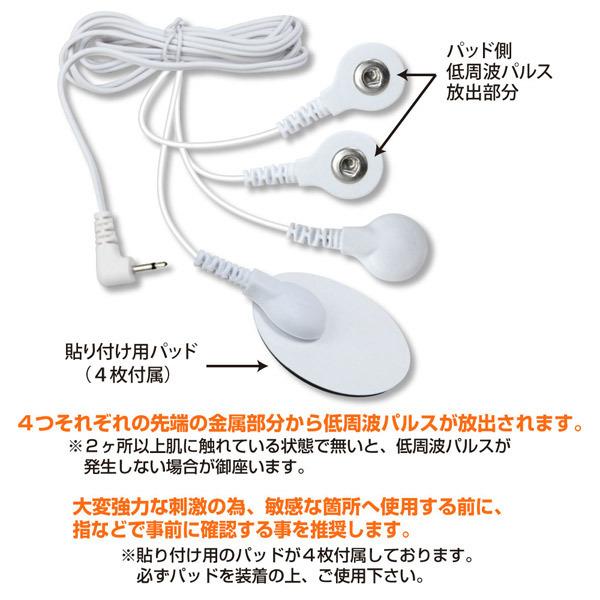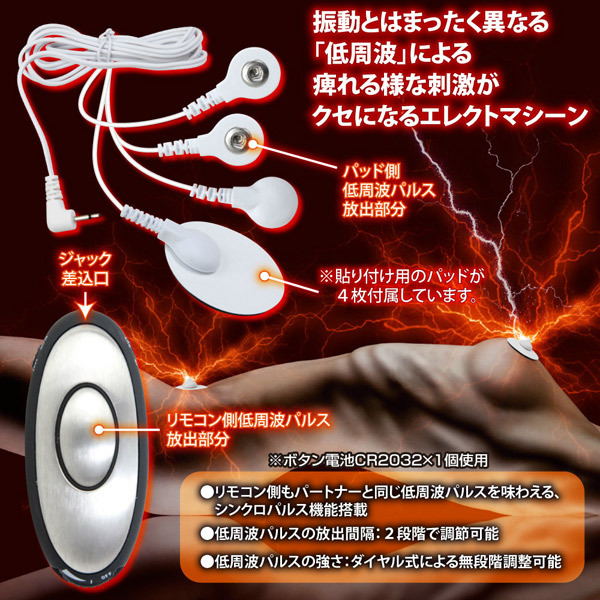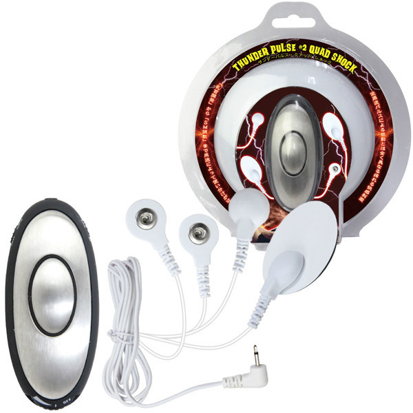 ただの振動では物足りない方へ!バイブとは異なる脈打つパルス刺激を4ヶ所同時に味わえる粘着パッド型ローター。●超刺激的な低周波パルスローター●パッドタイプの「サンダーパルス2」●長さ4cmの楕円形粘着パッド4枚付属●パルス放出部の先端にパッドを装着●取り外せるジャック差し込み式●ダイヤル式で簡単にコントロール●低周波パルスの強弱は無段階調整●放出速度間隔は2段階の切り替え可●リモコン側にもパルス機能を搭載。オナニーやSMプレイにも最適♪ビクンビクンと脈打つ低周波パルスの強烈刺激を味わえるエレクトログッズ「サンダーパルス2・クアッドショック」。リモコン側にもパルスが発生するシンクロパルス機能を搭載し、パートナーと快感を共有することも可能!お好きなポイントを4ヶ所同時に刺激出来るので、プレイの幅も広がりますね。※非常に強力な刺激の為、ご使用の際はOFFの状態から徐々に強めて調節してください。