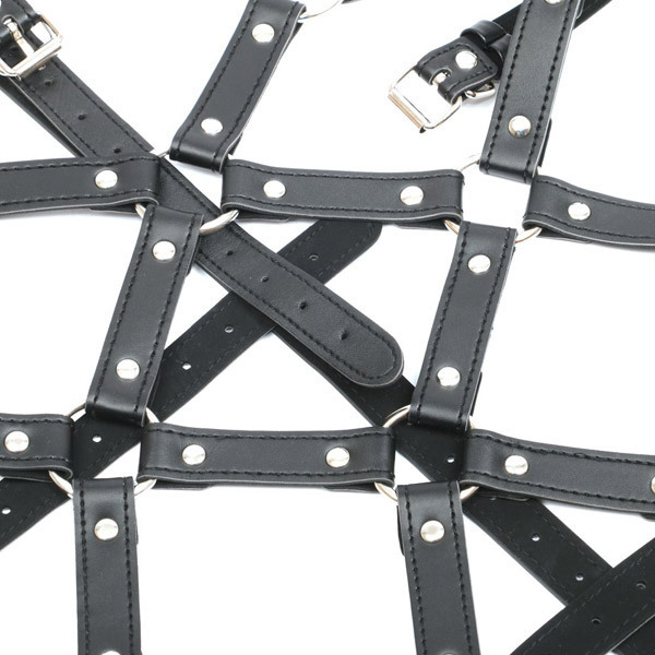人気の緊縛スタイル、亀甲縛りをハーネスベルトで表現したボンテージコスチューム。●亀甲縛り仕様のボンテージ●優しい柔らかなベルト素材●ハードなスタッズデザイン●各ベルトは長さ調節可能。着用するだけで亀甲縛りが完成!初心者さんでも緊縛プレイが楽しめるスタイリッシュなボンテージハーネスの緊縛ベルト。バストやウエストをサイズ調節できるので、本格的なSMプレイにもコスプレにも使えるハイクオリティなアイテムです。※画像では商品とは別にブラ、ショーツを着用しております。