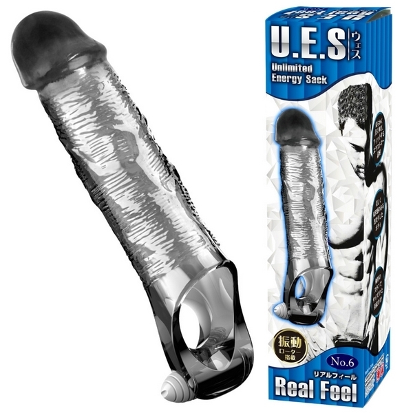 Wホールドでサイズアップ&ロングプレイ!リアルフォルムの極厚ペニスサック「UES(ウエス)6 リアルフィール」。●オールカバーの電動サック●リアルなフォルムの「No.6」●全長15.6cm、亀頭部4.0φcm●波打つ細ヒダの黒光りボディ●極厚仕様のエラストマー素材●伸縮素材でしっかりフィット●根元を締め付ける玉袋用の穴●玉袋裏側にミニローター付属。玉袋への振動でさらに射精感UP!極厚スキンで竿全体+玉袋をガッツリ締め付けて持久力を高めながら、振動快感も得られる男性補助グッズ。付属のローターは取り外し可能ですが、電池交換不可の使い切りタイプです。