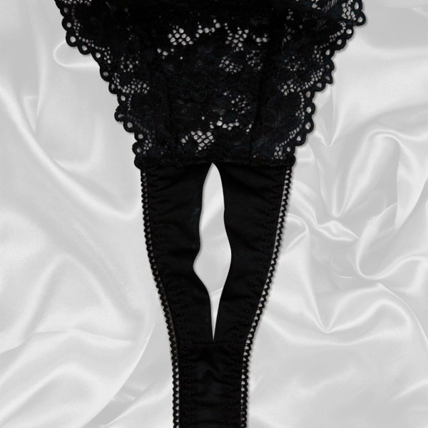 花柄の刺繍からチラチラ覗く素肌が目を惹くブラックカラーのTバックショーツ。Tバックで美尻アピールしつつ紐パンでパートナーを誘惑、そのまま押し倒されても大丈夫なオープンクロッチ仕様で勝負の夜は完璧!質の高い日本製で、トリコット生地を使用しているため着け心地も抜群ですよ♪