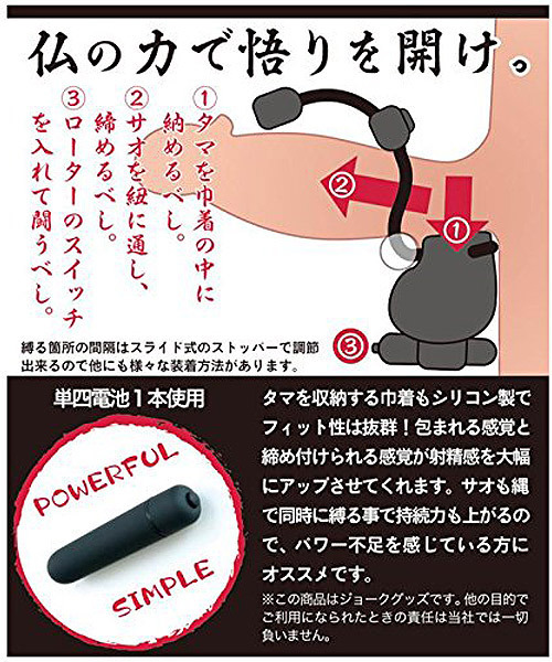 男の快感を助太刀!ループタイデザインのペニスリングと玉袋を包むシリコン巾着を一体化させた男性用補助グッズ「SUKEDACHINAWA(スケダチナワ)仏」。●伸縮性のあるシリコンタイ●スライド式で簡単に調整可●すっぽり包む玉袋用の巾着●シリコンでフィット感抜群●締め付け+包まれるW快感●内蔵ローターでさらに刺激●簡単操作のワンタッチ電源●ローターは着脱可能。仏の力で悟りを開く!玉袋を包み込みながら締め付け&振動刺激も楽しめる男性用補助グッズ。玉袋をシリコン巾着の中に納めてからサオを縄に通して縛り、ローターのスイッチをON!締め付けによる持久力UPだけでなく、玉袋を包んで振動を与えることで射精感も大幅にUP!快感もパワー不足もアシストしてくれるマルチなアイテムです。
