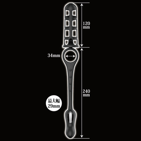 パッケージ:26.0×15.0×5.0cm 本体:サック全長12.0cm リング内径3.4cm アナルプラグ全長24.0cm USB充電式