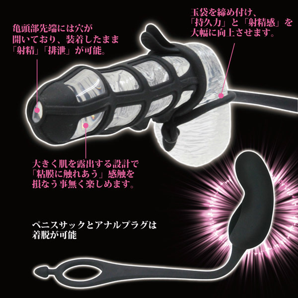 想像をはるかに超える未体験の絶頂感!メッシュ状ペニスサック+電動アナルプラグが合体した「PAアシストギア バイブレーター」。持久力サポートと前立腺刺激で射精感を大幅UP!高品質シリコン素材を採用したペニスサックは、挿入感を損なわないメッシュ形状!また、亀頭先端部に穴が開いているので装着したまま射精&排泄が可能です。さらに、玉袋を締め付けるリングで射精もコントロールしてくれます。アナルプラグは7パターンの振動機能を備えた電動タイプ!約90分の充電で約65分連続稼働するUSB充電式(USB充電コード付属)です。サックとプラグは着脱出来るので単体でも楽しめます。