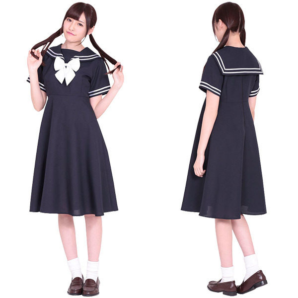 長めのワンピースでお嬢様風に♪紺×白カラーのセーラー服コスプレ。セーラー服では珍しいワンピースタイプ!ハイウエストデザインなのですっきりとした清楚な印象に♪可愛らしい白リボンをアクセントにしたスクール制服コスチュームです。※セット内容以外は付属しておりません。