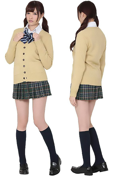 ホワイトカラーのブラウスに、COOLなベージュカラーカーデと落ち着いたグリーンカラーのチェック柄プリーツスカートがとっても可愛い制服コスチューム!ブルーカラーのストライプ柄リボンも付いた、これ1つでトータルコーデバッチリな4点セット。シンプルな王道コーデで普段からよく見かけるタイプだから、どんな方にも馴染みやすく可愛らしさを表現出来ちゃいます。グリーンカラーのチェック柄プリーツミニスカートで足長効果バツグン!ベージュカラーのカーデは羽織ったり、腰に巻いたり、ブラウスのボタンを開けてカジュアルに着こなしたり、カッチリ締めて清楚系に着こなしたり、アレンジの仕方はあなた次第。※セット内容以外は付属しておりません。