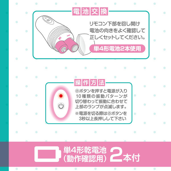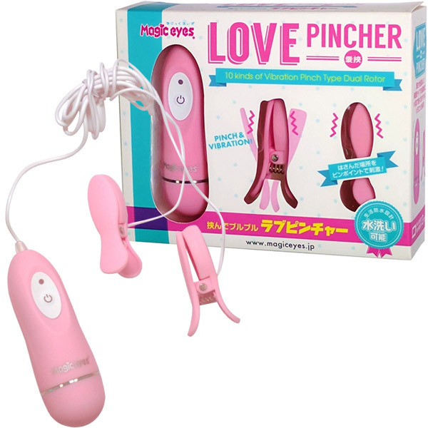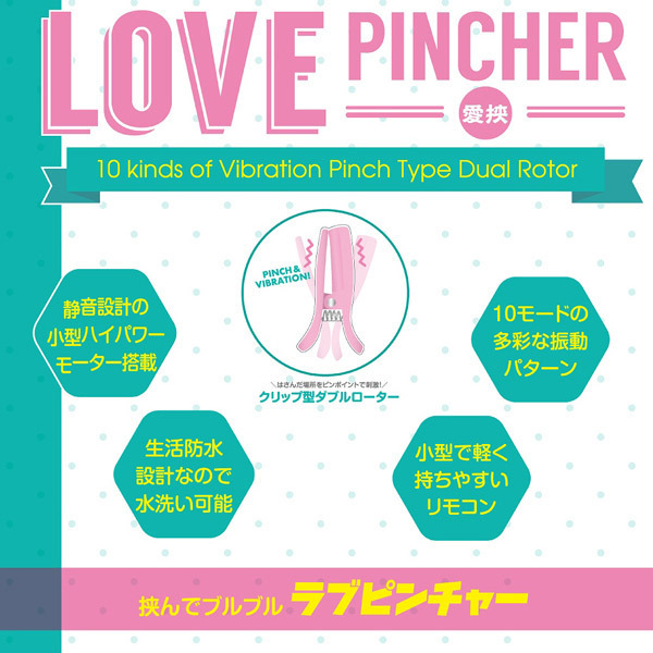 挟んでピンポイントでブルブル刺激!クリップ型ダブルローター「ラブピンチャー」。乳首やクリトリスなど、挟んだ場所をピンポイントで刺激できるダブルローター。サラッとした滑らかな肌触りで使用感抜群!痛すぎないよう計算された程よい締付け感で快感振動を伝えます。静音設計の小型ハイパワーモーターを搭載!軽く持ちやすいコンパクトリモコンで、10モードの多彩な振動パターンを操作可能!生活防水だから水洗いも出来て衛生的です。単四電池×2本付属。