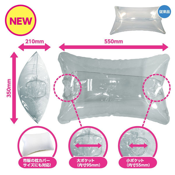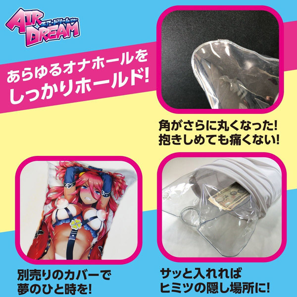 絶対バレない究極のエアピロー登場!抱きしめセックス&腰振りオナニーの必需品「エアドリーム」。市販の一般的な枕カバー(55cm×35cm)が利用できるのでカモフラージュもばっちり!カバーをかければ普通の枕、しかしその一枚をはがすと…?あらゆるホールと激しいプレイを受け入れる魔性のピローに豹変します。従来よりも生地の厚みがUPして強度も50%増!角に丸みがあるので抱きしめても痛くなりません。大小2ヶ所のオナホ設置口は両穴がつながっており、ロングタイプのオナホールなども問わず幅広く設置可能!大ポケット側は内寸9.5cm、小ポケット側は5.5cmです。タイプの異なるキャラを赤裸々な姿のまま封じ込めた別売りの専用カバーを被せれば、さらにリアルなセックスを体感できます。