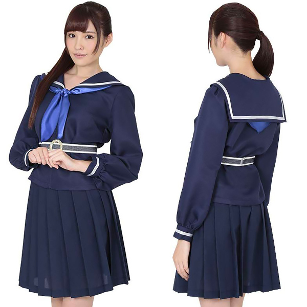 セーラー服にちょっぴりアレンジを加えたキュートな制服コスチューム。ネイビーカラーの制服は襟や袖口にラインがあしらわれ、膝上丈のプリーツスカートが可愛らしいコスプレ衣装です。爽やかなブルーカラーのリボンとウエスト部分のベルトが個性的なので、ありきたりなセーラー服に物足りなさを感じている方にもオススメ。