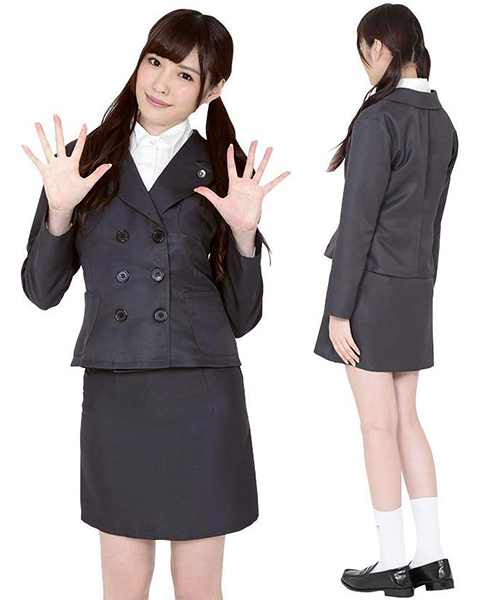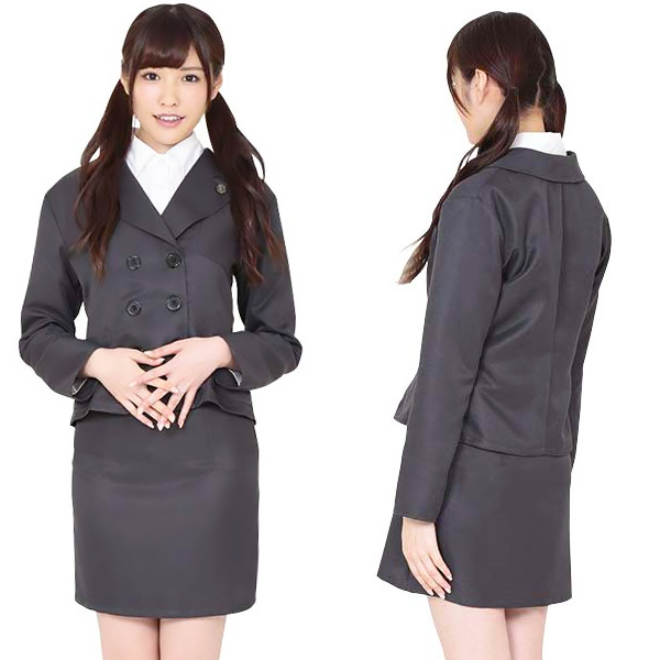 落ち着きのあるグレーカラーで統一されたダブルジャケットとタイトスカートが大人っぽい制服コスチューム。ジャケットにポケットが付いてるので小物を入れたり、短めのスカートはスタイルもよく見えおすすめ!清楚感を印象づけるデザイン性も高い制服です。