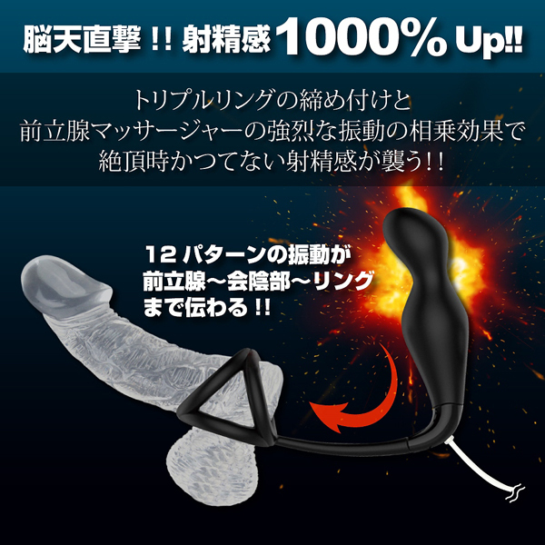 前立腺からペニスまで、広範囲の刺激が味わえる!電動エネマグラの登場です♪先端部は最大2.2cm、胴体部分は最大2.7cmの幅で凹凸感を楽しめるデザインとなっています。本体の大きさは8.3cmと少し小ぶりですが、12パターンもの強力振動を搭載!アナル内部でエネマグラが振動することで前立腺を刺激し、そこからコードが回り込むようにして会陰やペニスへと振動を響かせつつ、トリプルリングの締め付けで強烈な相乗効果を生み出します♪絶頂時には全身を電気が走り抜けるような射精感が襲いかかり、アッという間に果てていることでしょう。本体の素材はお肌に優しい高品質医療用シリコンを採用!生活防水も搭載されているのでお手入れ楽々♪また、オンオフはボタンを2秒長押しするだけの簡単操作だから扱いやすいのもポイント。手軽な電動エネマグラで、貴方もかつてない射精感を体験してみませんか?