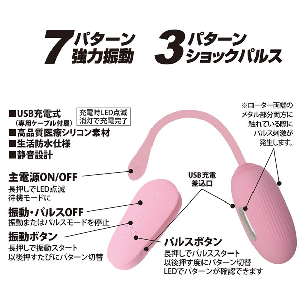 振動&低周波パルス機能 / USB充電式。未知への扉が開かれる…超強力振動と電撃低周波パルスの刺激が襲うリモコンローター!!電気刺激でビクンビクン収縮させつつ、強烈な振動で未知のアクメへ誘います。もう振動だけじゃ満足出来ない、クセになる刺激を求める方に長く愛されてきた低周波シリーズ●3パターンショックパルス●7パターン強力振動●高品質シリコン素材●生活防水●静音設計●専用USB充電コード付属、充電時間:60分、連続稼働時間:40分。
