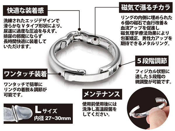 煮沸消毒でいつでも清潔に使える金属製の男性補助用ペニスリングが登場しました♪内径は2.7〜3.0cm、状態に合わせて5段階の微調整が可能。リングの内側に埋め込まれた6つの磁石が血流UPを促進、男性の象徴を力漲る猛々しい股間へ導けるようにサポート!デザインにも優れたメタル製のリングは尿道を圧迫しないため排尿の邪魔にもならず、長時間の装着でも快適にお使いいただけるペニス増強グッズです♪使用後のメンテナンスは、水洗いをして煮沸消毒にて殺菌消毒をおこなってください。