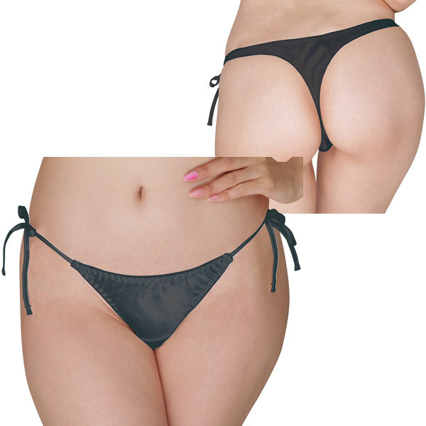 光沢感が美しいサテン生地の女性用Tバックショーツ。両サイドはセクシーな結びヒモ仕様で、結び目をパートナーに解かせる楽しみも!ブラックカラー