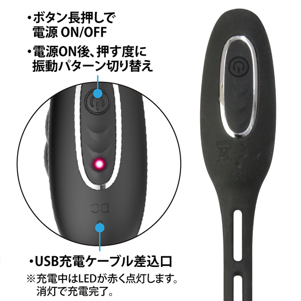 前立腺を刺激して勃起力・射精感を向上!更にダブルリングによる締め付けで持久力を高めメンズを徹底サポートするバイブレータ。挿入時前立腺を捉える絶妙なフォルム●高品質シリコン素材●12パターン強力震動●静音設計●生活防水●USB充電式(コード付属)