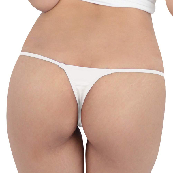 極小サイズの光沢生地で大胆に攻める日本製Tバック(白)。肌触り柔らかなTバックは穿き心地抜群!見えるか見えないかのギリギリ感がたまらない一枚です。
