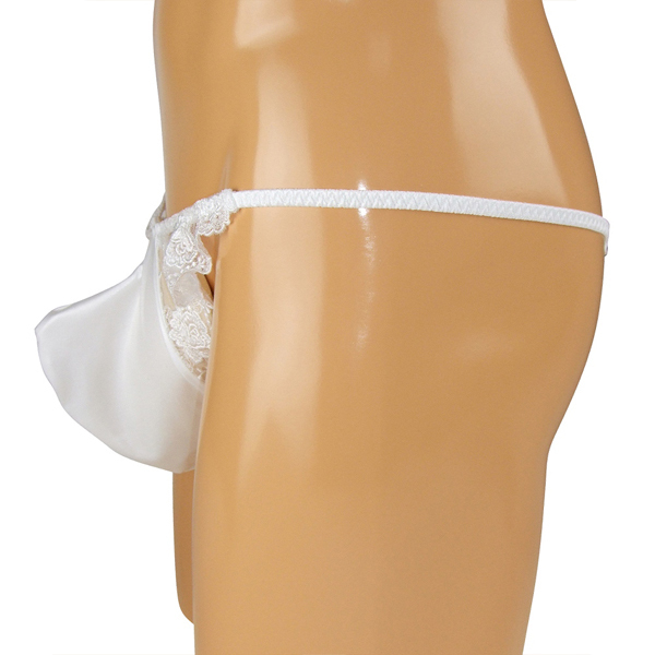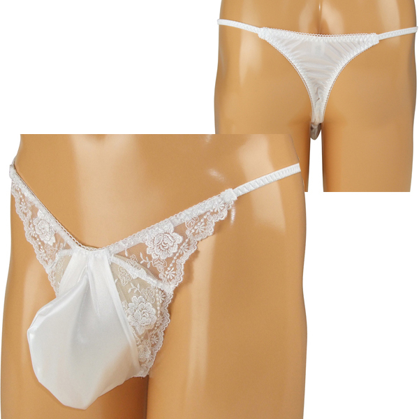 女装男子さん必見!花柄の刺繍レースで可愛く仕上げたメンズ用Tバック(白)。艶やかな光沢が美しいストレッチ生地を使用!エレガントなレースで貴男のアソコをキュートに魅せつけます♪縫製の丁寧な日本製