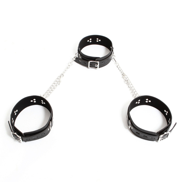 パッケージ:48.0×20.0×2.5cm 本体:首輪(55.5×5cm・ベルト穴5個)・太ももベルト(55.5×5cm・ベルト穴5個)・拘束チェーン41.0cm セット内容:首輪×1本、太ももベルト×2本、拘束チェーン×2本 素材:合皮、金具