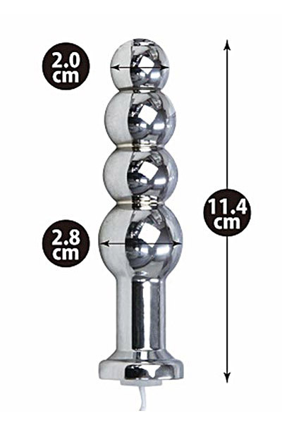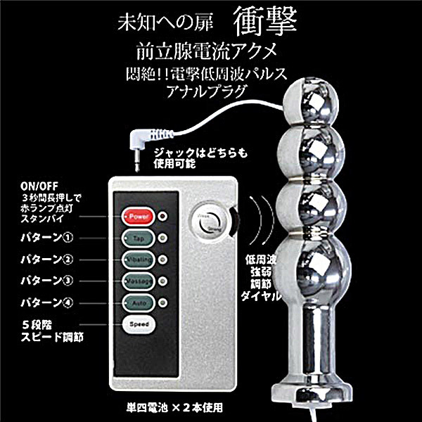 未知への扉、前立腺電流アクメ!低周波の刺激でビクンビクンと脈打つ刺激的な金属製アナルプラグ。より強いクセになる刺激を求める方に長く愛されてきた低周波シリーズ。挿入しやすい4連玉形状だから入門者にも最適。プラグの全体から痺れる様な快感の低周波を発生させます●4パターンパルスパターン●5段階パルススピード