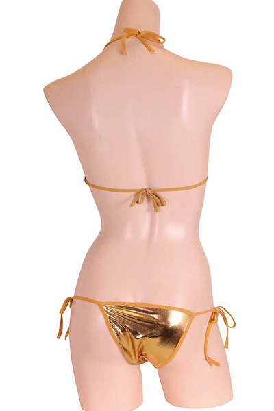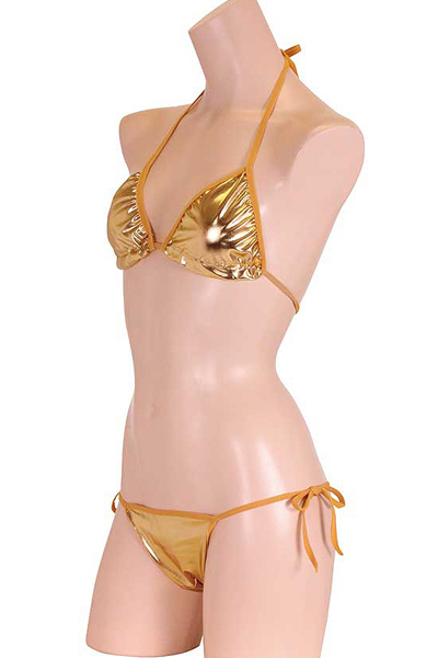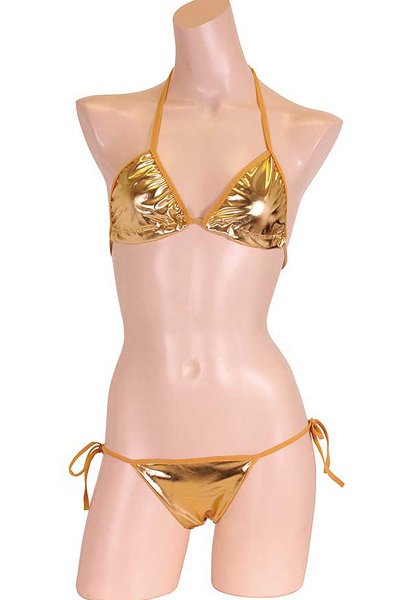 夏の海で美ボディを魅せつける!メタリック生地の存在感抜群なゴールドビキニ。太陽も羨む輝きで男の視線を独り占め♪金色カラーの華やかな紐ビキニを着れば、誰もが貴女に注目する!※こちらの商品は受注発注商品の為、ご注文から発送までに3、4営業日掛かる場合が御座います。