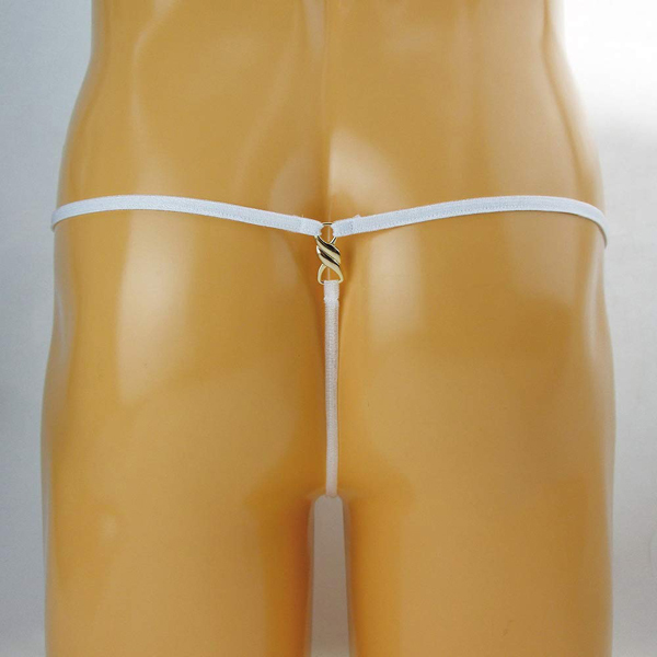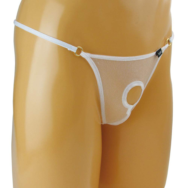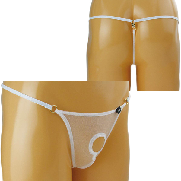 素肌が見えるシースルー生地でエロティックに見せつけるメンズ用Gストリング(白)。サオが突き出せる穴あき仕様!通気性抜群な生地で夏や暑い日にも涼しく快適♪サイドは金の丸型リング、後ろは捻じれリングでデザインにもこだわった男性用セクシーランジェリー。