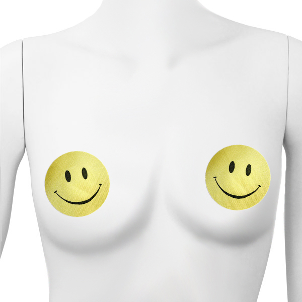 ニコニコマークが胸元で笑う可愛いニップレス2枚セット。肌保護のため乳首に触れる中央部分には粘着しない素材を使用!