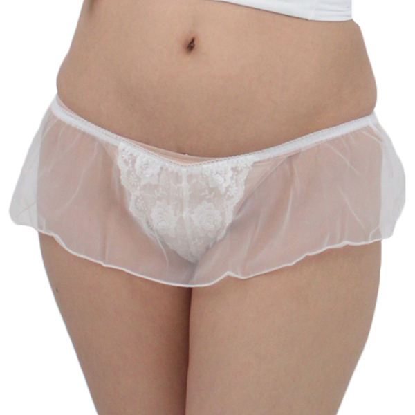 動くたびヒラリと揺れる♪可憐なレース刺繍のTバックとシースルースカートが一体型になった日本製セクシーショーツ(白)。レースの先に見えるTバック姿に美しくもエロスを感じさせるデザイン!ここぞという夜に着用したい一枚です。