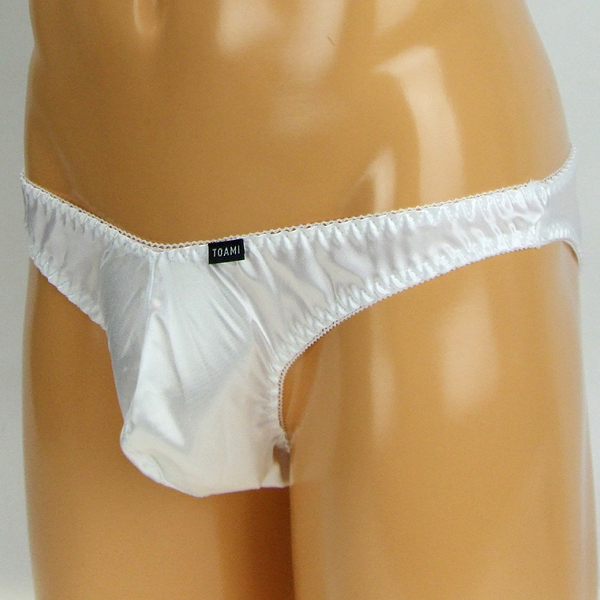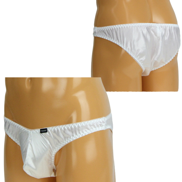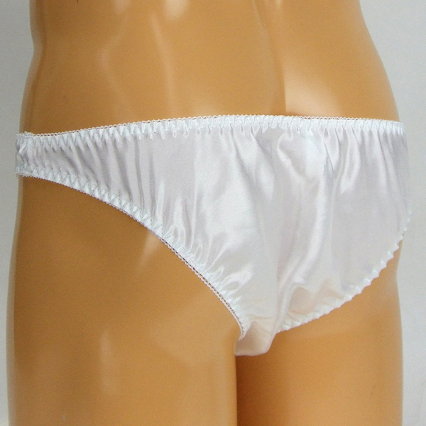 女装用下着にも最適♪上品な光沢のあるストレッチ生地に縁のくしゅっと感が可愛さをプラスした、下半身に程よくフィットする穿き心地抜群のメンズ用日本製フルバック(白)。