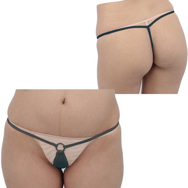 光沢のある滑らかな生地が心地よくフィット!下半身を美しく演出するブラックカラーの日本製Gスト。フロントリングでゴム紐と股布をジョイントした魅惑的なデザイン♪布面積が少ないため、ショーツラインが気になる時にも活躍すること間違いなし!