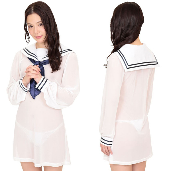 水で濡れたように透け感のある極薄仕様のセーラーワンピ(白)。白で清純そうに見せながらも、ストレッチの利いたネットメッシュ生地でセクシーに演出!夏や暑い日に最適なセーラーコスプレです。袖口、襟には2本のライン入り