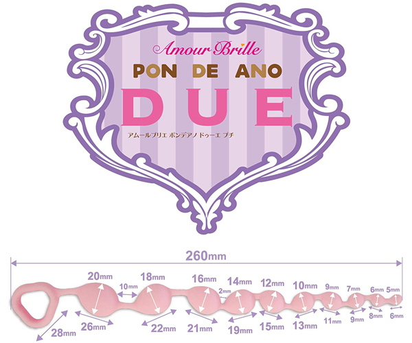 輝く女性のためのシリーズ「アムールブリエ」で人気のアナルラインナップ「ポンデ アノ」から新バージョンが登場しました。ぼこぼこした可愛らしいフォルムは、女性のアナルプレイにぴったり!100%ピュアシリコンを使用して安心安全な、10個のビーズが連なった取っ手付きのアナルビーズです。全長は26cm、先端は5mmの極小サイズなので、初心者の開発にもピッタリです。最大径は20mmと開発済みの中級者、上級者でも満足できるサイズ!石鹸等での洗浄も可能なので、衛生面でも安心です。プチサイズ