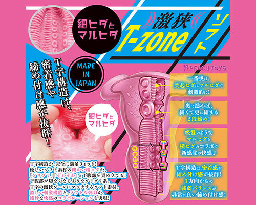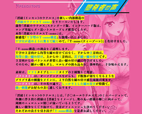 締め付け&密着感抜群のT字型T-zone構造が絶妙な快感をもたらす日本製の非貫通オナホ。「淫紋のウテルス」シリーズ第2弾が登場!3方向から繰り出される程よい締め付け感♪奥へ進むほど狭まる2段締め構造に加えて、吸盤のような丸ヒダや突起ヒダで刺激する!本品は柔らか弾力素材のソフトタイプ