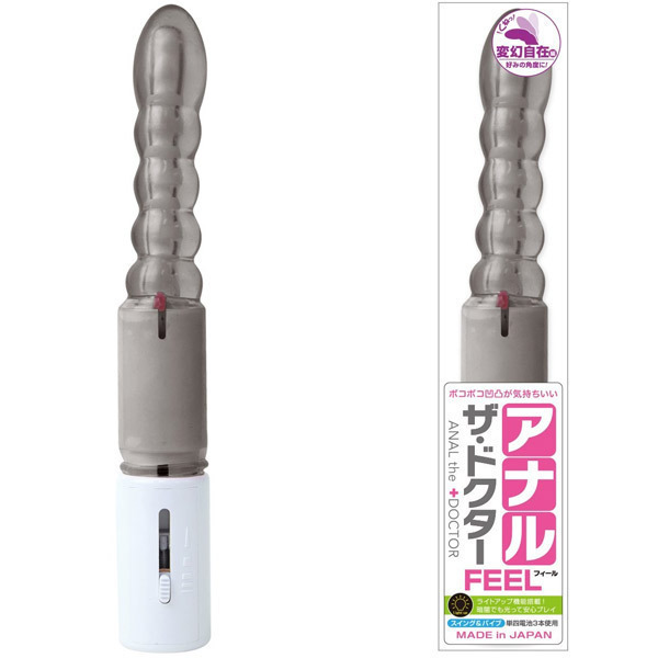 くねっと曲げて刺激!アナル開発に最適な人気のアナルバイブシリーズから好みの角度に曲げられるNEWタイプ「アナル・ザ・ドクター フィール 変幻自在編 スモーク」が登場。こちらの『フィール』は連続する凸凹が気持ちいいお団子ボディが特徴。バイブレーションはスライドスイッチで簡単に調節可能!暗闇で使うと幻想的な雰囲気を楽しめるライトアップ機能も搭載されています。アナル初心者さんでも安心してスムーズに挿入できる日本製アナルグッズです。単四電池3本付属。※仕様変更によりスイング機能は搭載されておりません。